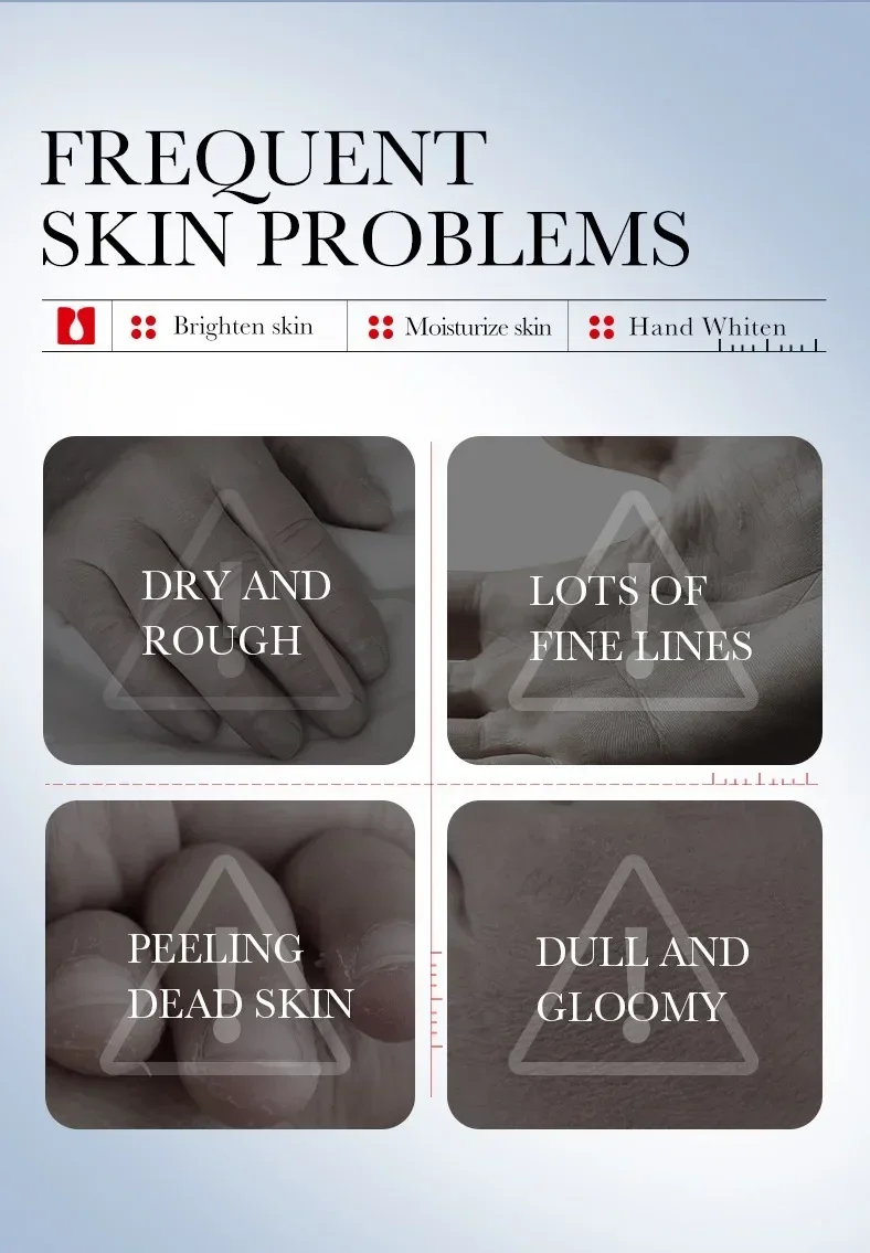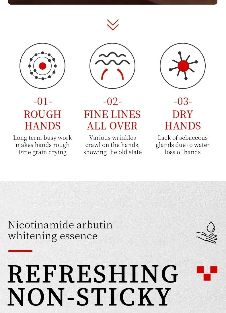 ▶Add moisture to your hands, leaving your hands soft and smooth, revealing delicate hands. Helps replenish moisture needed by the skin, helping to improve dry, white and brighten skin.